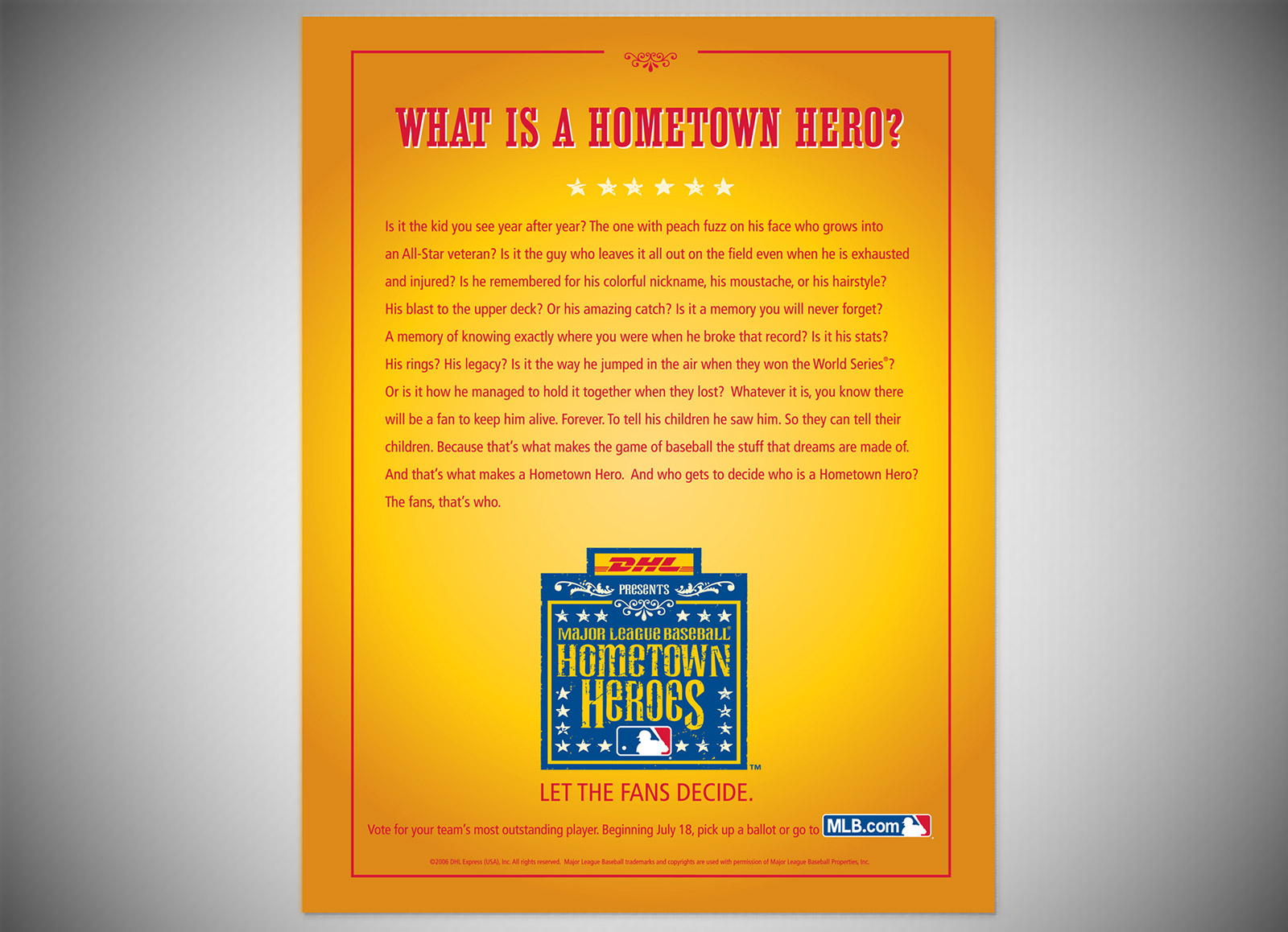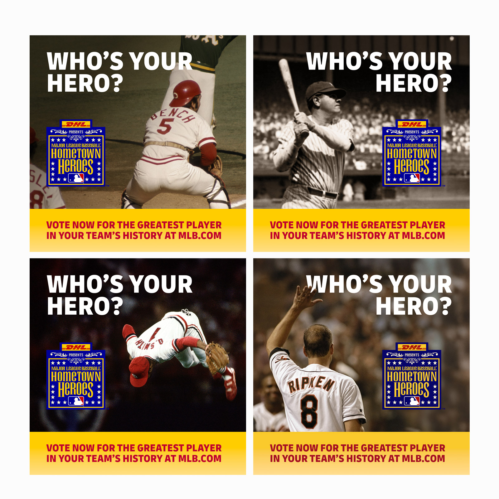 For DHL and Major League Baseball’s Hometown Heroes program, I designed the core visual identity and campaign logo. The system needed to work across every MLB franchise, while aligning with DHL’s global brand standards.
